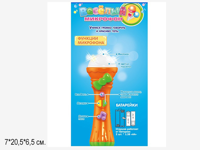 Для включения игрушки нажмите самую верхнюю кнопку на микрофоне. Средние кнопки: одна воспроизводит веселую песенку про алфавит, при нажатии второй кнопки включается микрофон и вы можете говорить в него и петь - Ваш голос будет звучать громко и четко.Самая нижняя кнопка на микрофоне в форме нотки воспроизводит разные мелодии.Все музыкальные фрагменты сопровождаются игрой разноцветных огоньков в верхней части микрофона. Форма микрофона сделана так, что малышу будет удобно держать его в руке и одновременно нажимать на кнопки.